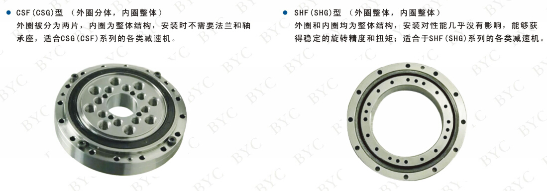 该型轴承外圈被分为分体结构,内圈为整体结构,安装时不需要法兰和轴承座,适合CSF/CSG系列的谐波减速机。