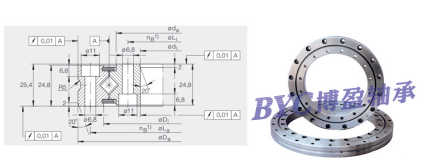 BYC-香蕉视频直播 是两列圆柱滚子在呈90度的V形滚道上通过尼龙隔离块被相互垂直交叉排列,所以香蕉视频直播可承受径向负荷、轴向负荷及力矩负荷等多方向的负荷。内外圈的尺寸被小型化,极薄形式更是接近于极限的小型尺寸,并且具有高刚性,BYC香蕉久久网香蕉视频直播精度可达到P2级。因此适合于工业机器人的关节旋转部、机械加工中心的旋转台、精密旋转工作台、医疗机器、计算器、IC制造装置等设备。