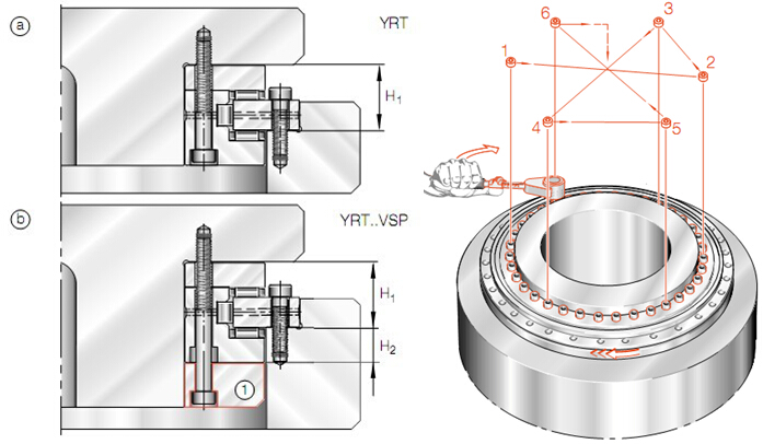 BRT(YRT)转台轴承 由一个推力/向心座圈,一个推力/向心轴圈,一个推力垫圈,两个滚针保持架组件和一组向心圆柱滚子组成。座圈和轴圈有均布的安装用螺钉孔。该型轴承具有高轴向和径向承载能力。高倾斜刚度和极高的精度。适用于回转工作台,卡盘和铁刀头以及测量和实验中的轴承配置。该型轴承对与之相配的设备零件的要求也较高。安装时需控制安装螺钉的扭紧力矩。